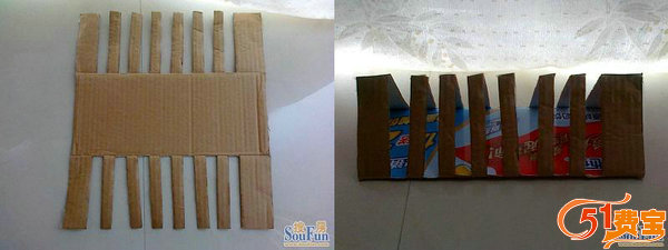 3、修剪第一段及第三段的纸板,剪成梳子状;
