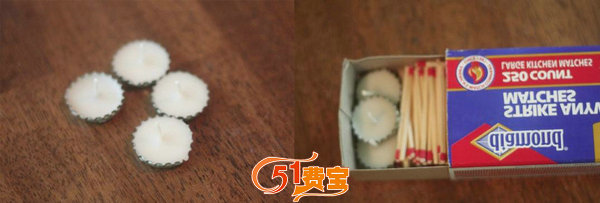 4、把做好的瓶盖蜡烛连着若干火柴放在一个小盒子里,平常收藏在干燥的地方备用即可。