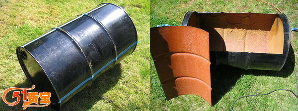 1、首先,肯定要先把油罐破开,切下侧面的一块作为盖子,先把它放在一边吧,我们等会还要进一步diy。