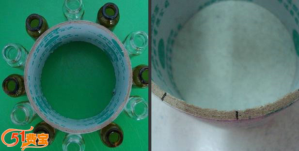 接着,按照瓶子的数量和颜色,间隔地绕着胶纸芯等分排开。位置定好之后,用笔在卷纸芯上做好记录。这里我做的风铃是有上下两层,每层分别用不同颜色的玻璃瓶,所以在做记号的时候要注意,两层的位置都要做好区分,最好可以用两种不同颜色的记号笔,就不会打乱了。