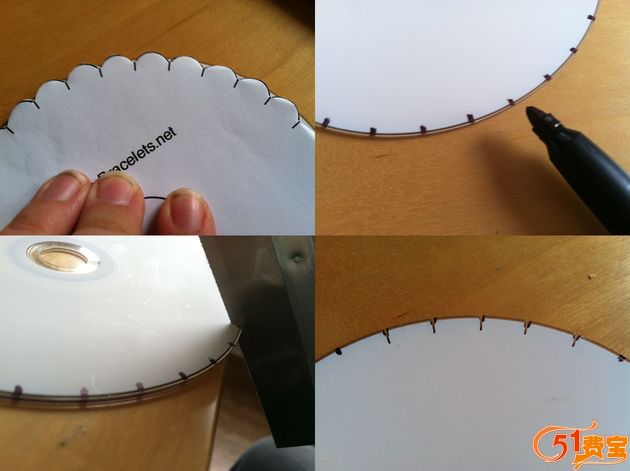 1、在电脑上用绘图软件绘制与光盘直径一样大的圆,然后在圆周上均分出上面的小缺口,打印下来。根据纸样用记号笔在废光盘上画出记号。