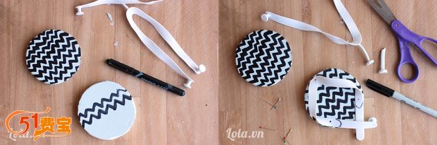 2、用手喷漆涂上颜色以后,用记号笔画上波浪花纹。用pin针在EVA材料上别两根皮筋,有点像人字拖的样子。