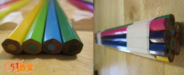 1、用万能胶把各种不同颜色的铅笔头粘在一起,并在胶水干透前用胶带把它们紧紧地扎起来。