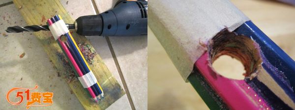 2、找一个直径比手指略粗的钻头安装在手工钻上,在万能胶水已经干固的铅笔头之间钻一个孔。