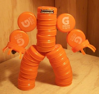 3、利用绳子构造玩具机器人的身体躯干,在四肢以及身体上穿入打孔汽水瓶盖。
