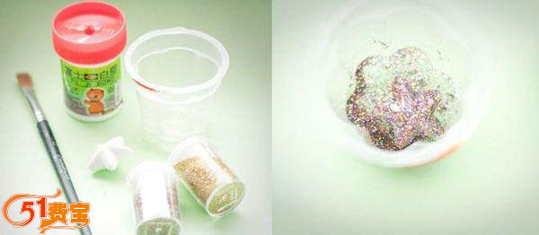 最后附带地讲下亮粉五角星的制作,51费宝是用现成的文具店买的宝丽龙星星用胶水刷上亮粉做成的,如图: