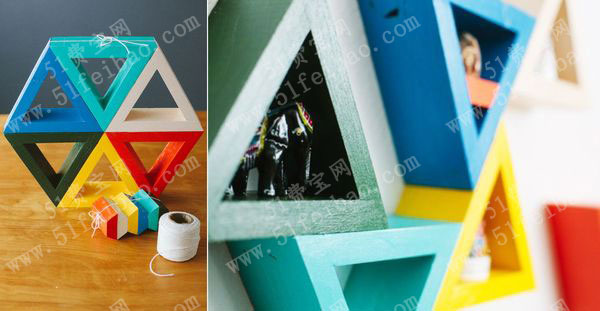 3、也可以把一组三角形饰品架组合成更复杂的几何结构,三角形里面的空间放入玩具、自制的小饰品、生活杂物等等。