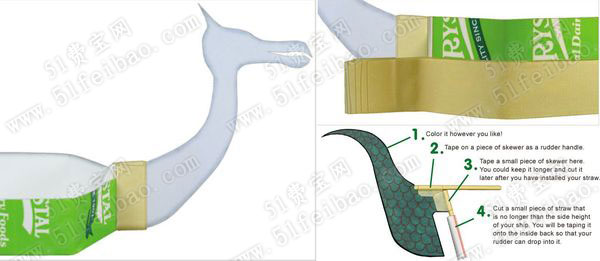 在酸奶盒顶部折起的密封条的位置,如图用胶带绑紧一个从硬纸板上剪下来的逼真龙头。在船舱底部,用胶带贴3-5层,形成加厚并防水的船底。而船尾,这是通过剪断的一次性筷子和胶带做成可左右摆动的结构。