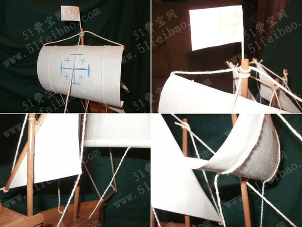 8、按照你熟悉的习惯用白纸制作帆船的船帆和舰旗,在舰旗上你可以参考51费宝的做法画上你的独特旗帜图案。