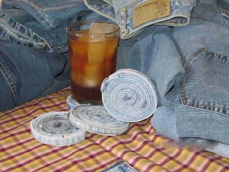 废旧牛仔裤做杯垫想当简单,只要沿着牛仔裤的裤管剪下来长长细细的一条牛仔布,然后按照《回收旧报纸、旧传单DIY实用锅垫》里介绍的方法盘呀盘呀,盘成一个比茶杯底略大的圆饼,再用针线缝牢就可以了。如图