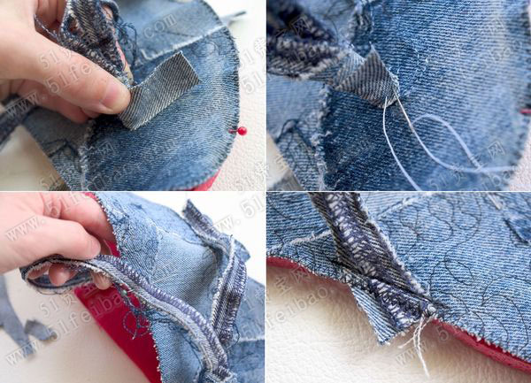 手缝牛仔布拖鞋所需材料:废旧牛仔布衣物或者裤子、针线、剪刀、大头针、鞋垫。通过下面的图解制作步骤,一起跟随51费宝学习如何手工缝制布拖鞋的制作方法吧。