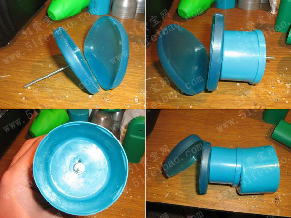 2、从肥皂盒底部钻孔,打穿后用螺丝把肥皂盒跟其他塑料罐的盖子连在一起,构成恐龙的头和身体。