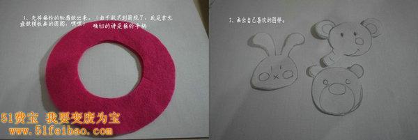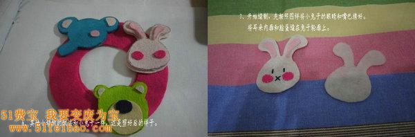 10、塞好棉花之后将翻口封好,摇铃上装饰的小兔子头像就ok了;同样地把其他两个动物头像也填好棉花;