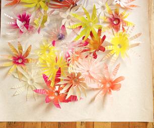 2、用颜料喷雾在饮料瓶塑胶花上喷上自己喜欢的各种颜色,注意色彩的层次和过渡