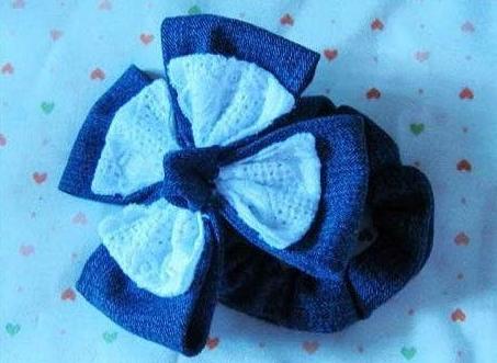 8、最后就做好一个好看的花形发圈。旧衣服变身后的制作效果不错吧,你也自己动手做个一个哦!