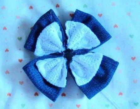 6、从旧牛仔布上剪下一小块长条形的布,将它塞入花瓣中央与之前做的发圈粘连在一起。