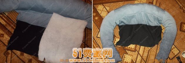 把旧衣服的两只袖子摆成合抱状,用针线把袖子接起来,就是一个圆圈。把衣服主题的深色布料多余的部分塞到里面,缝线固定住。