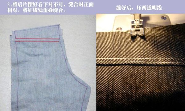 2、裁剪出裤子的后片,把飞机头和裤子下半部缝在一起,压上一道明线。