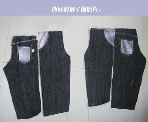 4、如图上文字做好裤子的口袋,前后片放好备用。