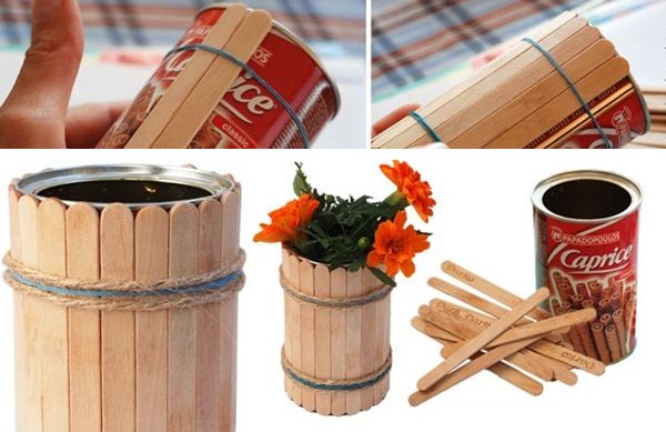 2、制作简单笔筒。在八宝粥、易拉罐、椰奶等瓶子表面用皮筋或绳子将一排的雪糕棍绑在表面,就是一个简单的diy笔筒,放几只常用的笔还是很方便的。