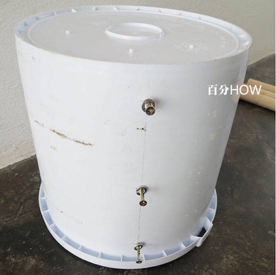 4,将垫圈和螺丝先安排到油漆桶的每个螺丝孔上,然后放入木棍,用螺丝将桶身和木棍固定在一起。在锁的时候你可能需要一手顶着桶内的棍子,这样才能锁得牢固。
