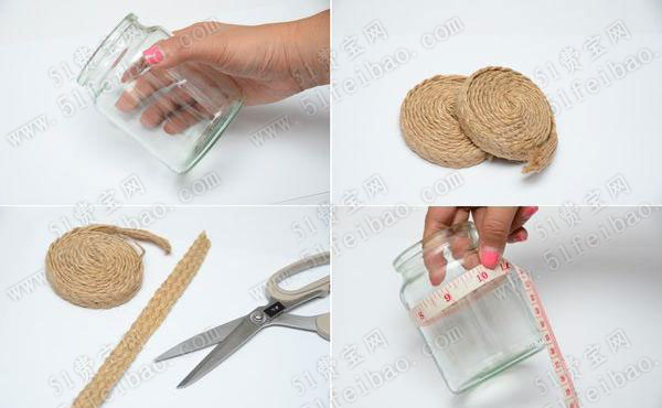 1、如果使用的是玻璃罐,例如最常见的广阔罐,也同样可以制作diy笔筒。方法与酒杯笔筒不同的是,这里我们利用绳带,而不是普通绳索来做。如图所示,先用卷尺量一下罐子周长。