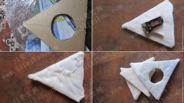 使用聚酯纤维填充包裹三角纸板,用订书机固定每块三角形纸板上的聚酯纤维填充。按照同样的办法,把剩下的三块硬纸板也同样包裹好。