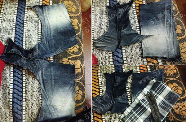 1、上一次牛仔裤改造后裤腿上面剩下的一点牛仔布料,剪下来,再找来拉链和辅助的格子布料。