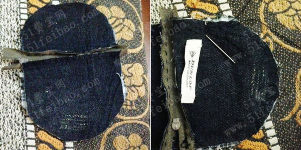 3、缝完拉链以后把整个牛仔布包反过来,把布料剪成椭圆形的,找来商标一起缝上去。