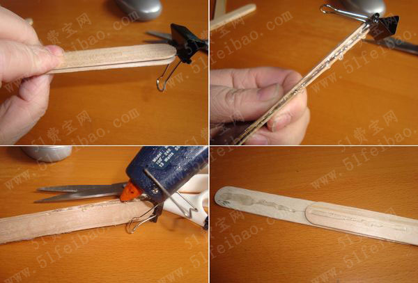 3、接下来我们开始利用长尾夹制作投石机的投臂,如图,用两根棍子涂上热熔胶后夹出长尾夹的一端,并在里面再加入第三根冰棍棒。