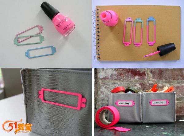 4、附加标签。把标签固定器涂上指甲油,个人觉得彩色也许会好看一些,所以就用霓虹粉指甲油涂了一个。在标签上涂指甲油非常有趣,这做起来相当容易在涂自己的指甲一样,在金属片上一层一层的涂直到全都涂匀。 在收纳盒朝着自己的一侧上装好标签固定器,就正式完成了,然后把你的零碎物品装进去就行了。