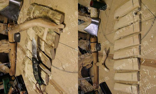 3、用小刀,在每一块橡木片以及把手上劈削出绑定的凹槽和榫口。