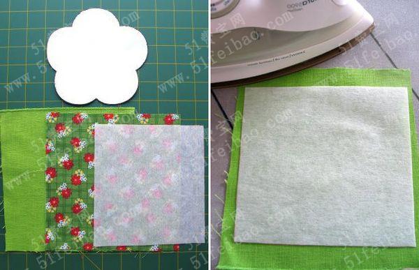 1、准备好的方形布三块,花形纸型一张,大头针若干,还有花朵的纸样草图。将方形布(棉布及铺棉)和花形纸叠好,用大头针穿到一起,熨平。