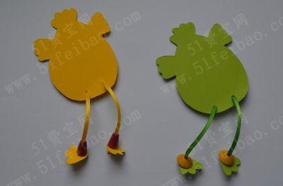 2、用铅笔在色卡纸上分别画出小鸡的身体以及脚爪,剪下。用锥子在身体底下以及脚爪上扎孔。