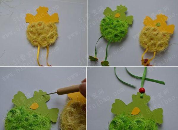 6、粘上嘴巴,以及在小鸡挂饰的头顶扎孔系上挂绳。