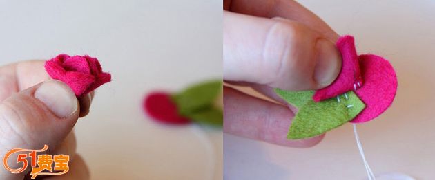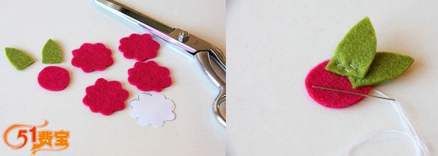 1、用不织布剪成一下的小部件,先用针线把底片和绿色的叶子缝起来。