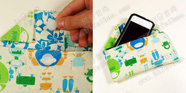 7、最后装上魔术贴,一个漂亮的无需针线缝纫的制作手机袋就做好了。